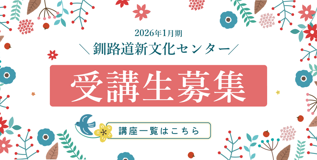 - 【釧路道新文化センター】1月期 受講生募集中 釧路道新文化センターでは1月期の受講生を募集中しております。 ご受講希望の…
