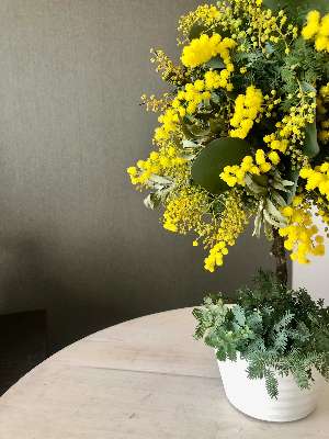 ミモザとグリーンを使いオアシスに三角に飾り付け、トピアリー(ツリー)を作ります。オアシスの水分を吸いながらゆっくりと乾燥し、ドライフラワーになっても楽しむことができます。机の上や、玄関などのスペースに彩りを与えてくれます。