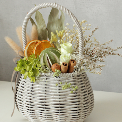 6月「シトラス香るバスケット」:かごの中にドライフルーツやお花を入れた楽し気な雰囲気のアレンジ、W21㎝×D12㎝×H29