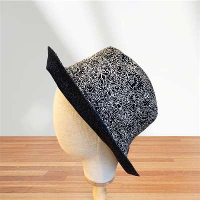 岡山デニムと花柄などの生地を使って、ブリム(つば)が広い帽子を作ります。