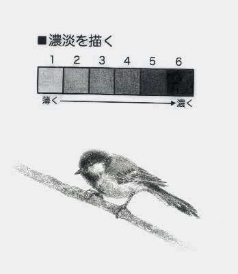 鉛筆での濃淡の描き方とさまざまなの作品から濃淡の表現方法を学びます。また、写真などを使用し、動物や植物を描きます。