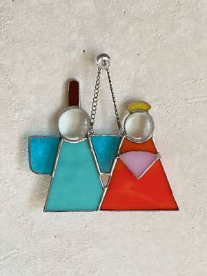 お雛さまは明るいオレンジ色、お内裏さまは青系で袖の部分は花柄で透ける水色のガラスを使っています。壁やスタンドに飾れる掛けるタイプのお雛さまです。