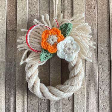 ふんわりとした毛糸をねじって土台を作ります。手が痛くならないから、どなたでも安心。仕上げにお花や葉っ…