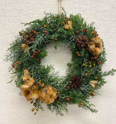 シンプルで落ち着いたトーン、爽やかな香りも楽しめるリースを作る一日講座です。サツマ杉とブルーアイスを…