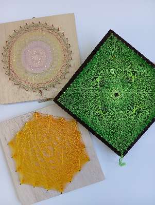 板に打たれた釘に、色とりどりの糸を一本一本かけて模様を描いていくアート作品です。規則的に糸をかけるこ…