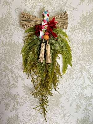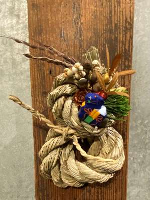 縁起の良いひょうたんの形に、羽のように広がるツクバネの実をあしらい、干支である馬を添えてお正月飾りを…