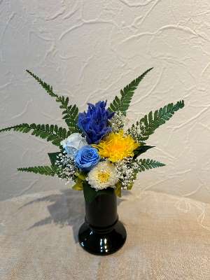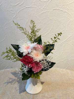 プリザーブド加工されたお花を使い、春のお彼岸にむけてお供え花をお作りしましょう。お水やりの心配もなく…
