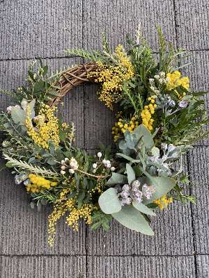 春の訪れを告げるミモザに、グレビリアやユーカリ、テトラゴナ、ナンキンハゼを合わせて上品な彩りのリース…