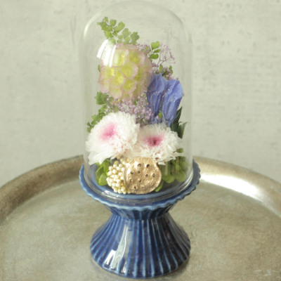 印象的なシルエットの青い花器に、色とりどりの可愛いお花をアレンジ。 ほこりをガードしてくれるガラス…