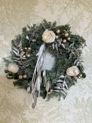 プリザーブド加工されたヒムロスギのリースにきらめく花材を組み合わせて大人っぽく上品なウインターリース…