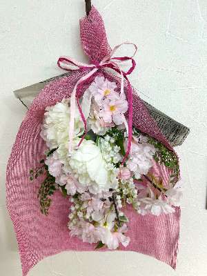 桜,スズラン、ピオニーなどのお花を使った春らしいスワッグです。グリーンを加え、リネンやラフィアでラッ…