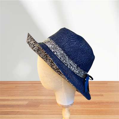 岡山デニムと花柄などの生地を使って、ブリム(つば)が広い帽子を作ります。 サイズ調整のリボンをつけ…